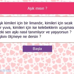 Aşk testi, duygularınızı daha iyi anlamanıza yardımcı olabilecek etkili bir araçtır.Bu test, aşk nedir sorusuna yanıt bulmak ve aşık mıyım diye sorgulamanız için tasarlanmıştır.